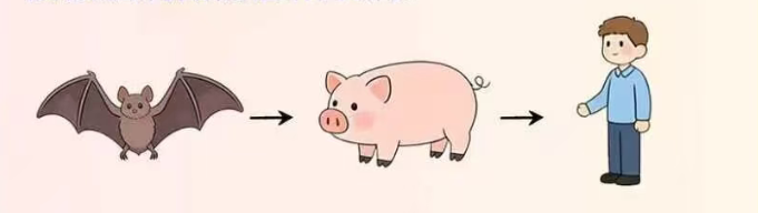 1.蝙蝠-家畜-人传播:猪等家畜食用被携带尼帕病毒的蝙蝠体液、分泌物或排泄物污染的水果、水果制品(如生椰枣汁)后感染,人类通过直接接触病猪而感染发病。